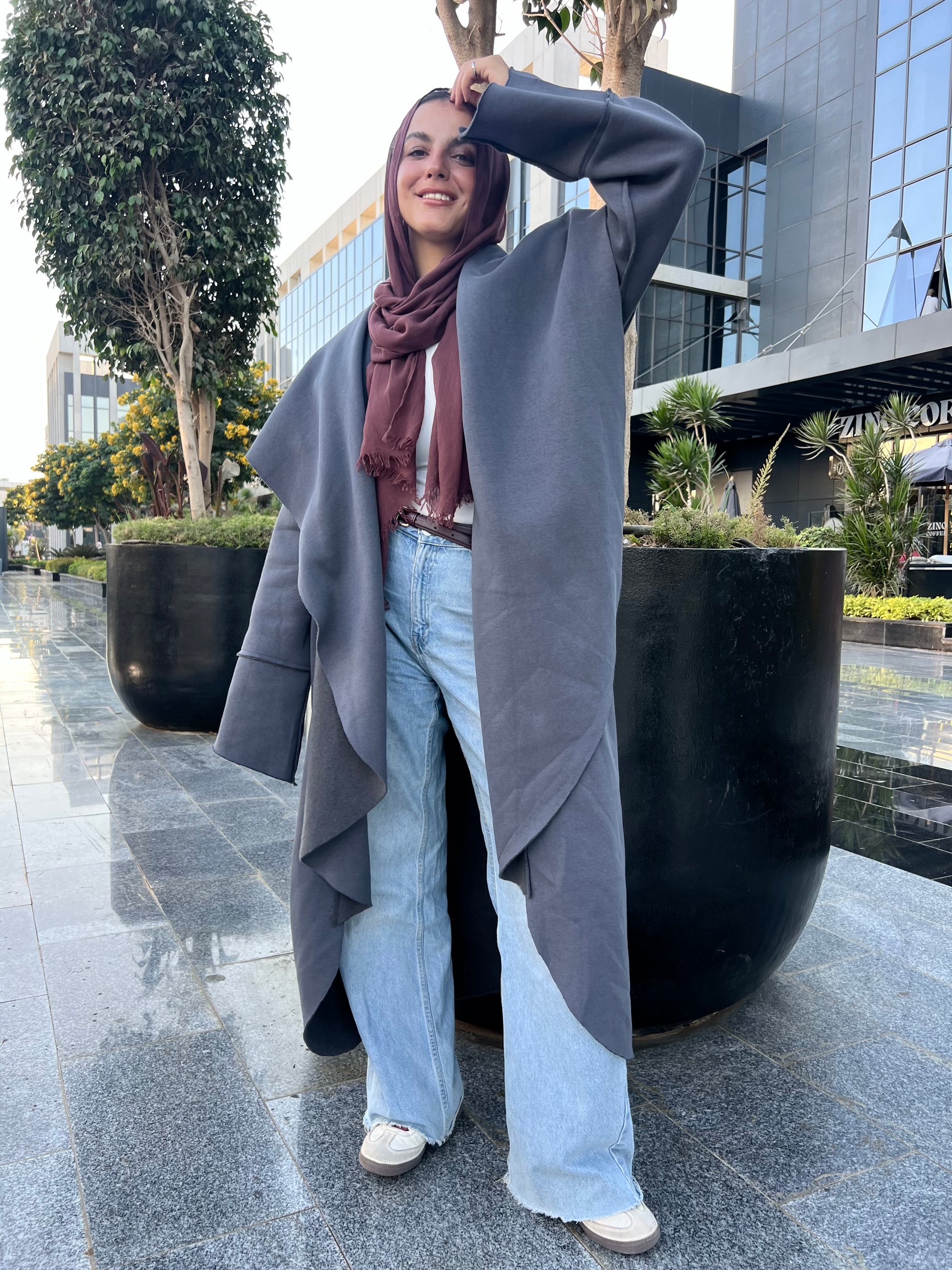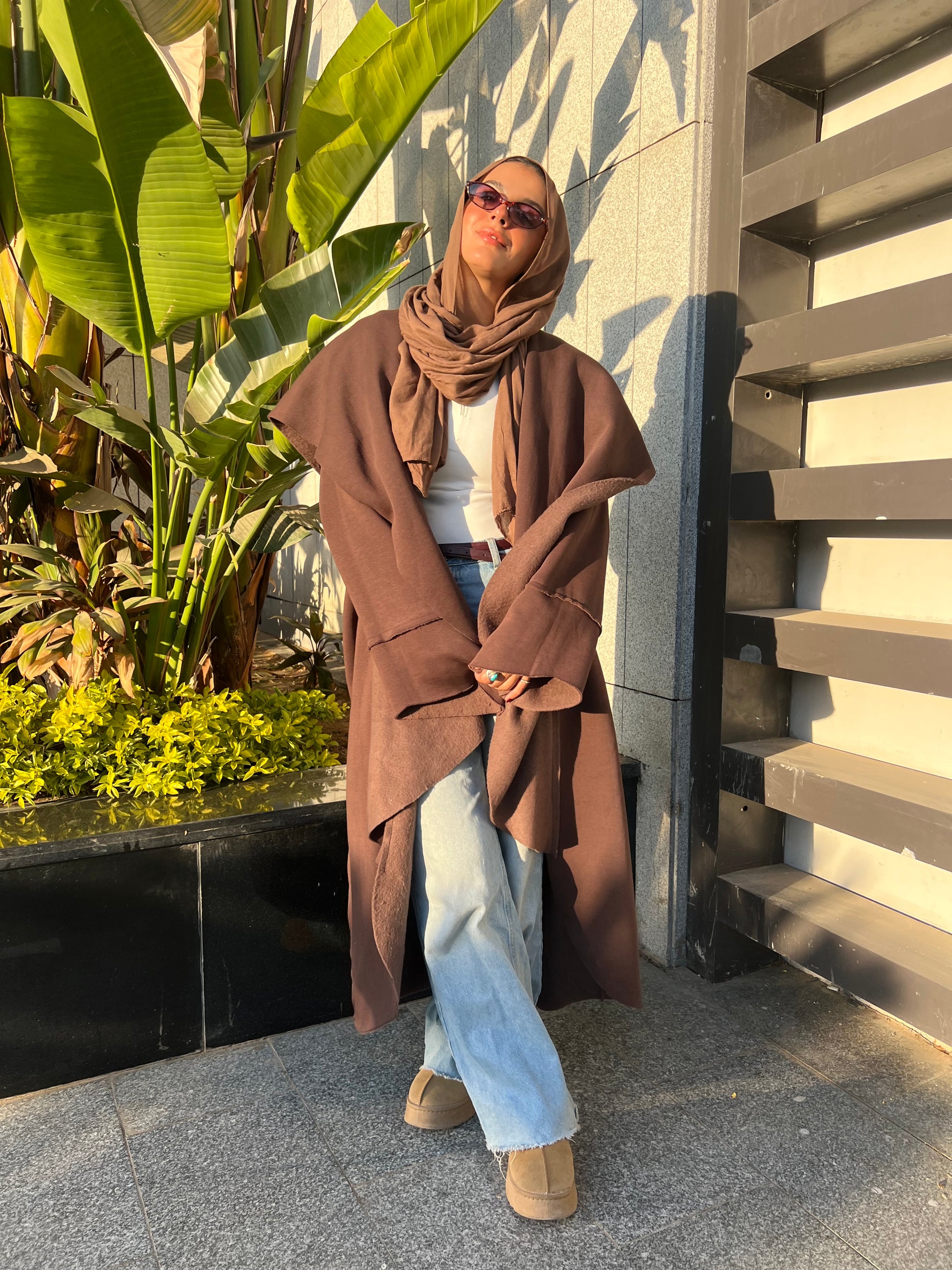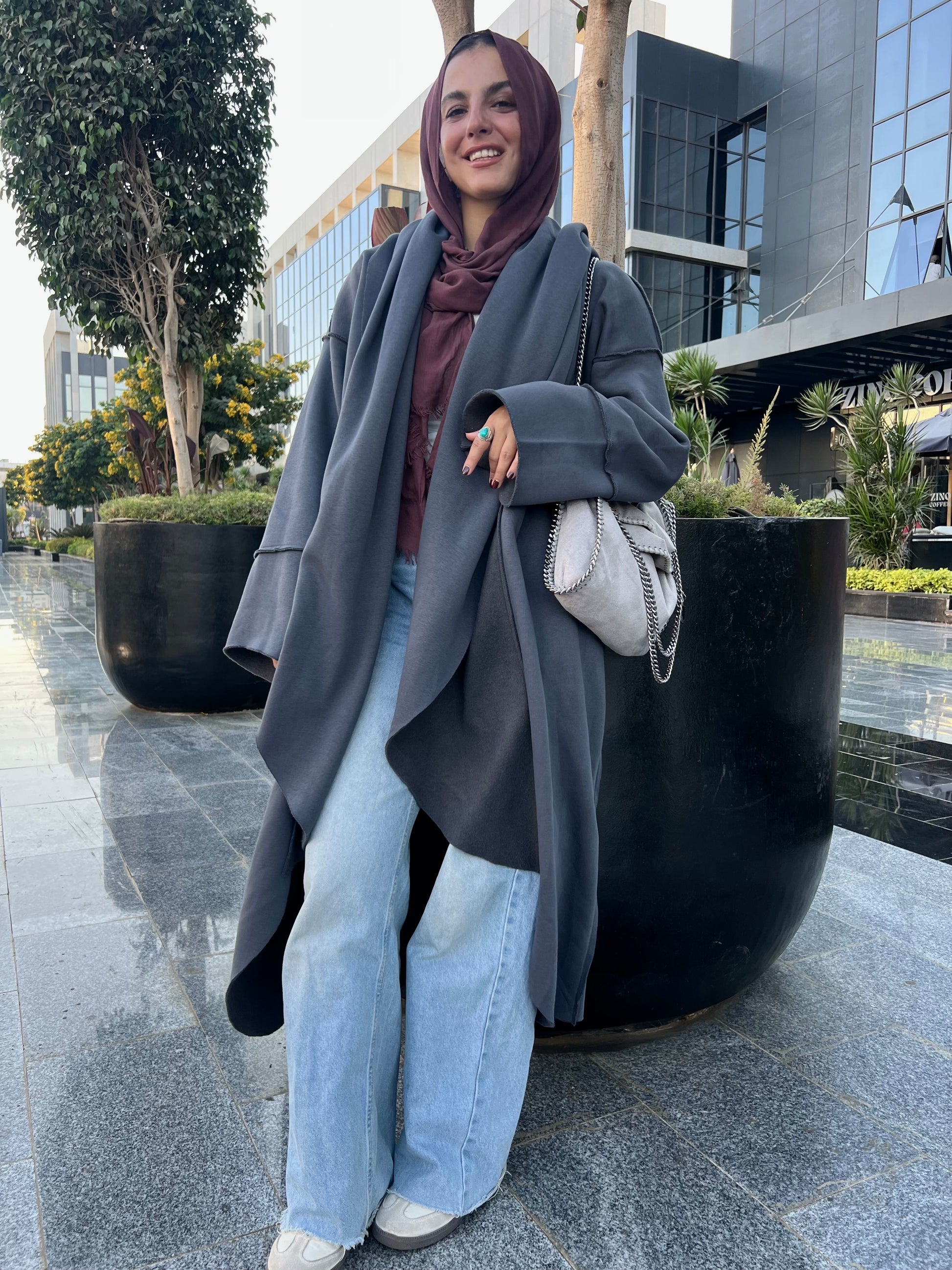 A long cozy cardigan in elegant tones of black, dark grey, and chocolate brown 🤎