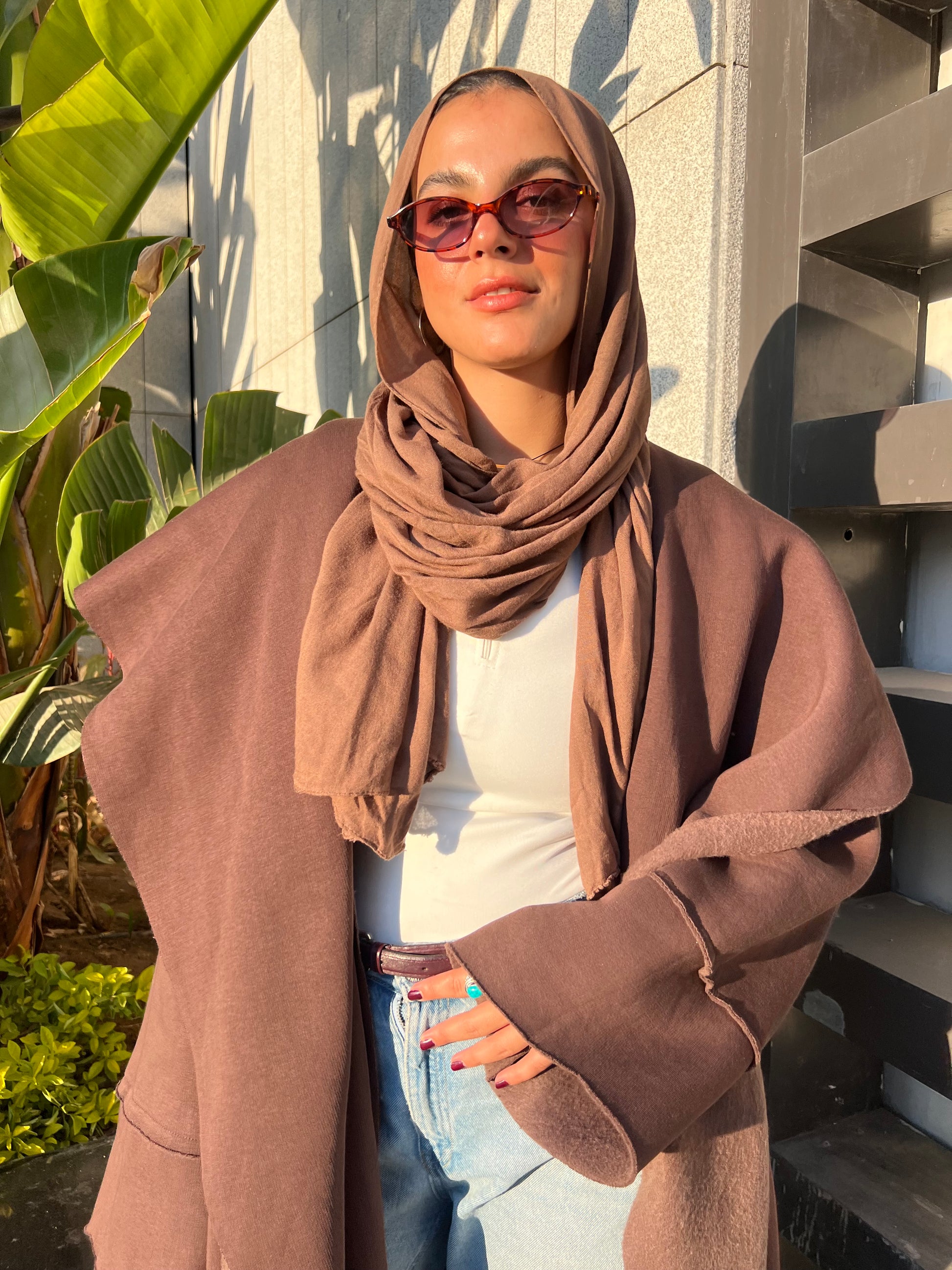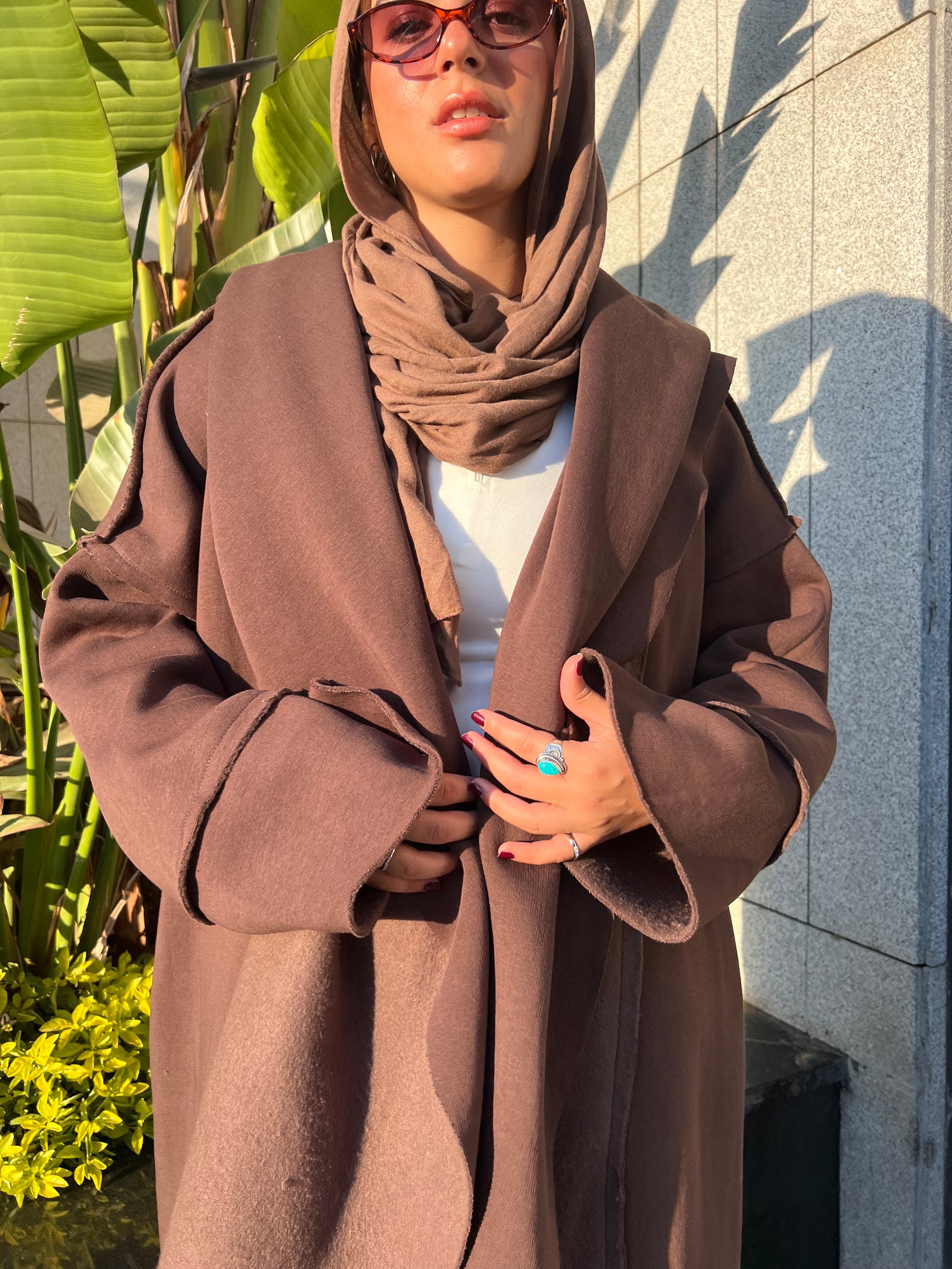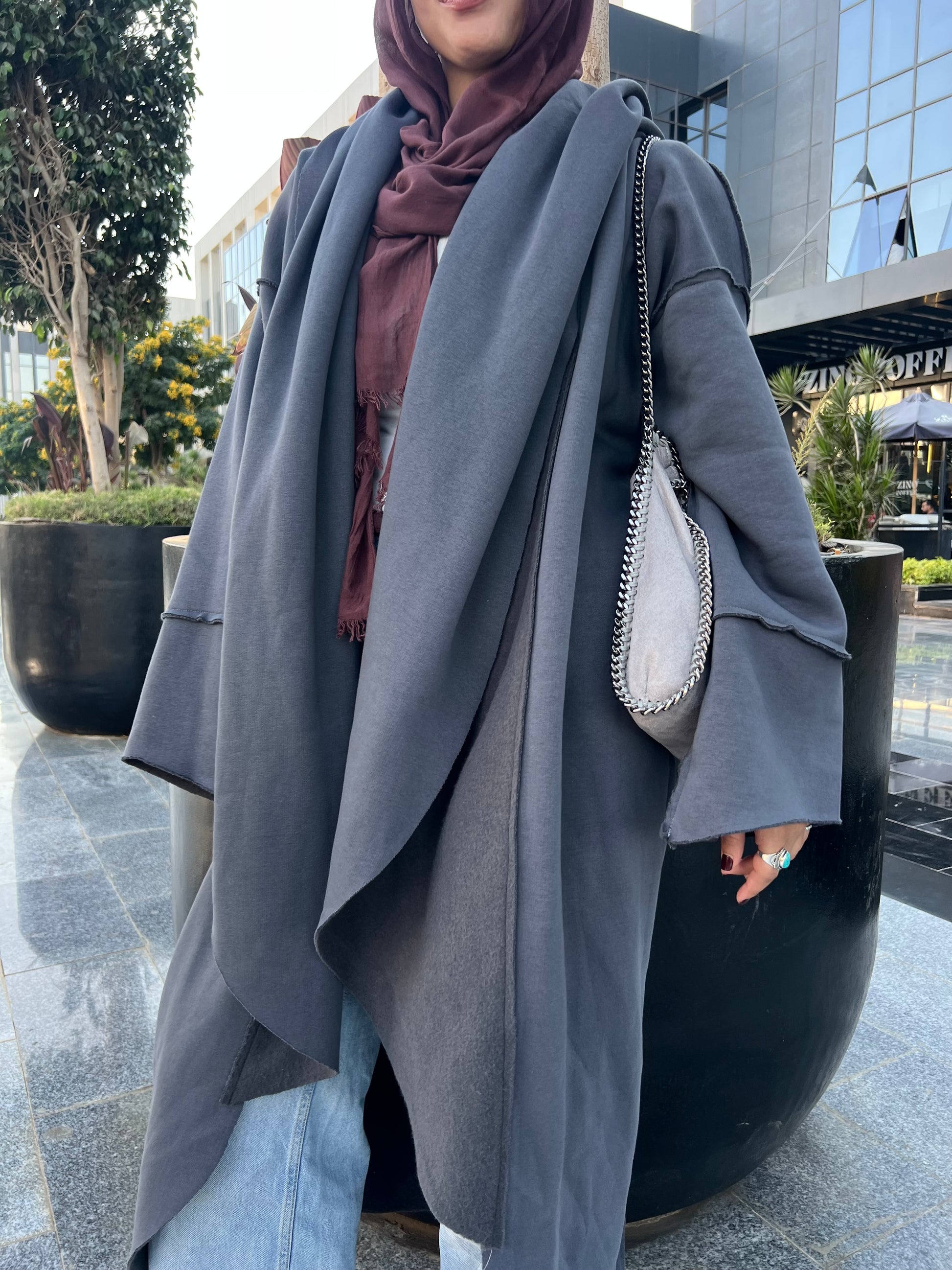 A long cozy cardigan in elegant tones of black, dark grey, and chocolate brown 🤎